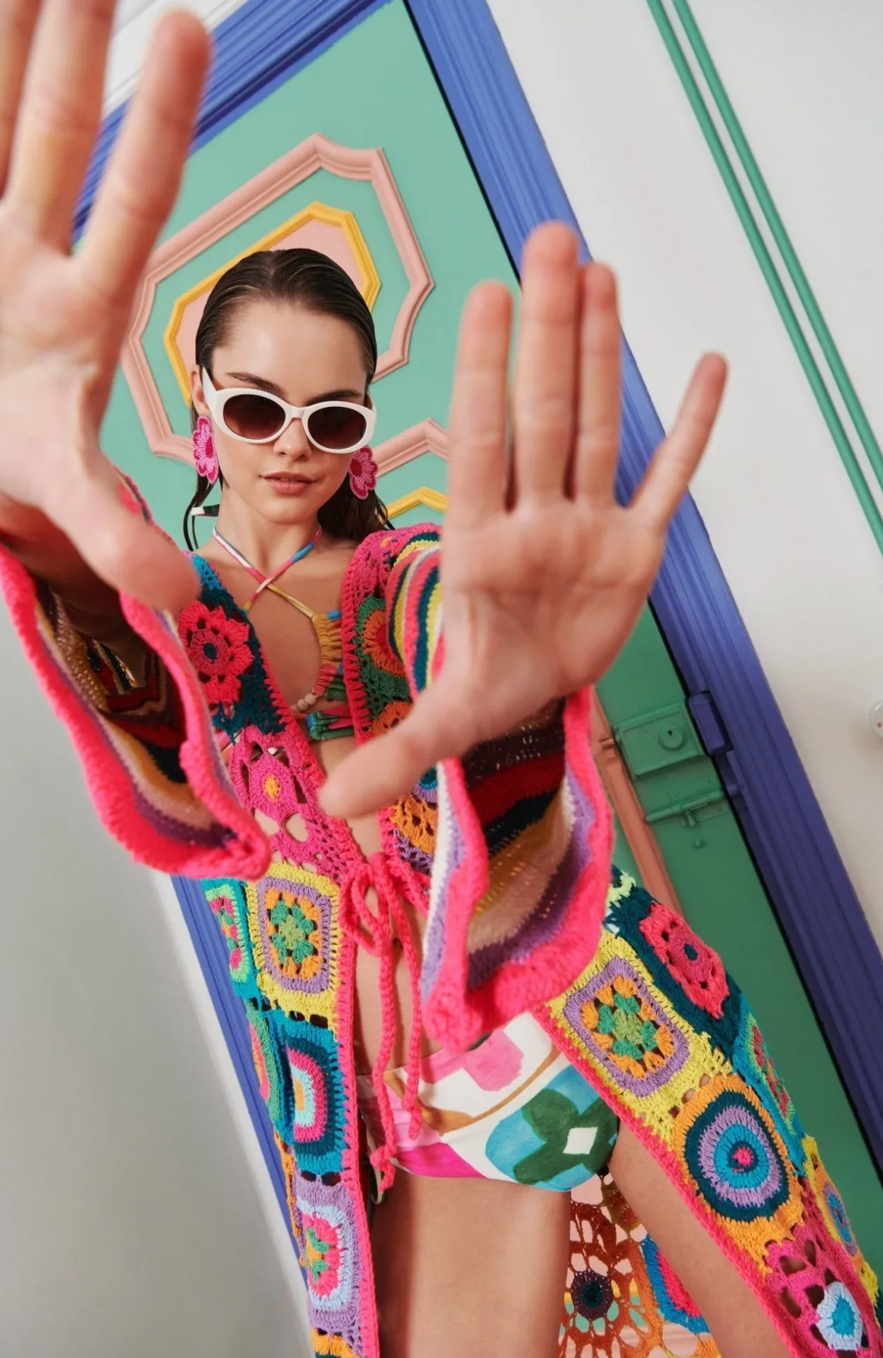 Dramatic Open Square Crochet Coverall With Zig Zag Long Bell Sleeves. A Colorful Eye Catching Piece.