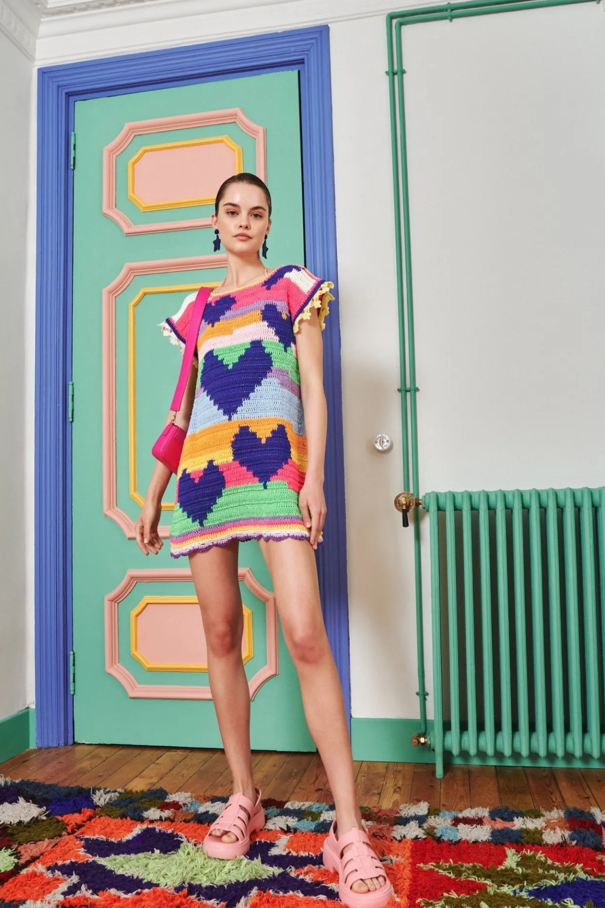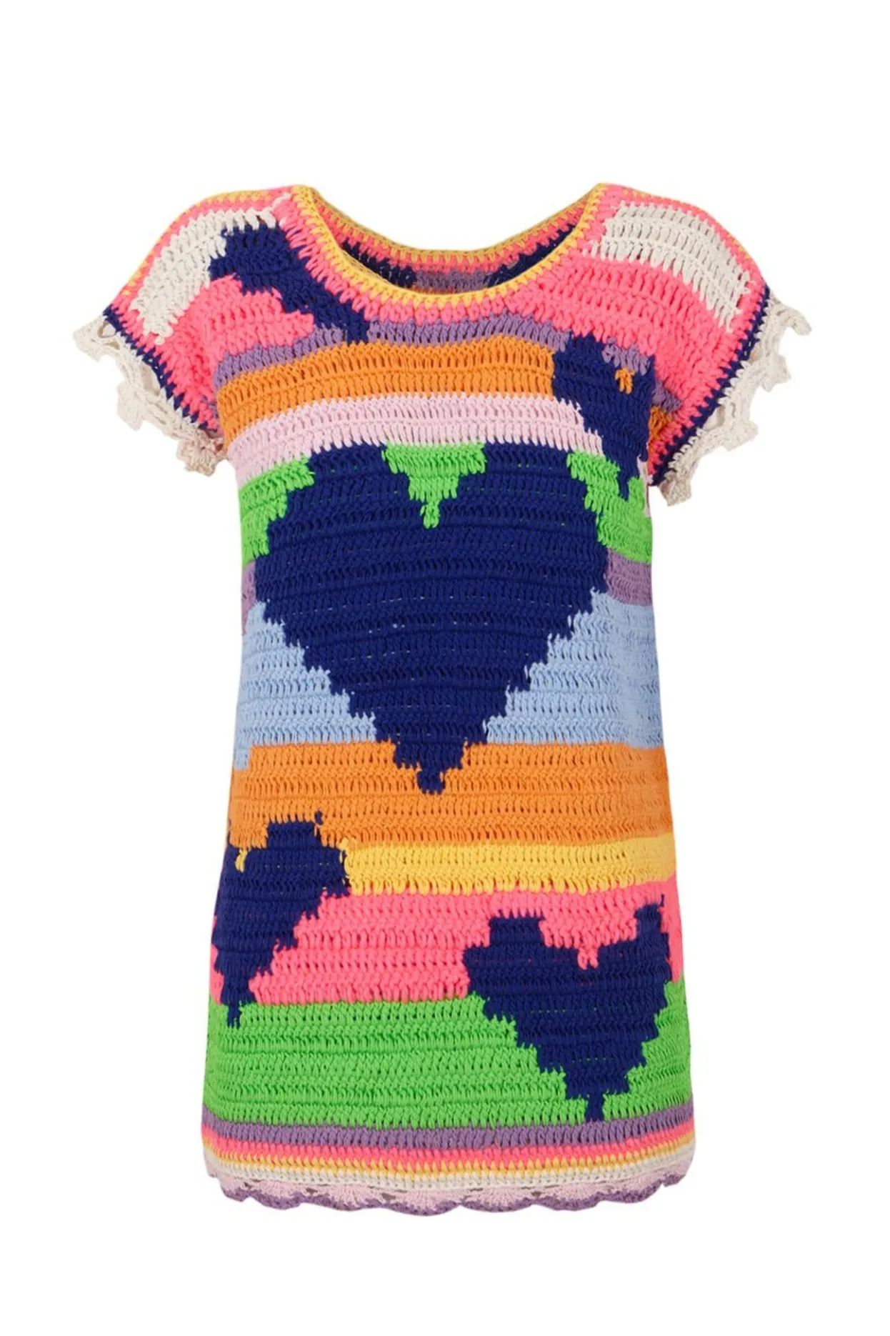 Colorful Crochet Mini Dress With Blue Heart Design, You Can’T Help But Fall In Love.