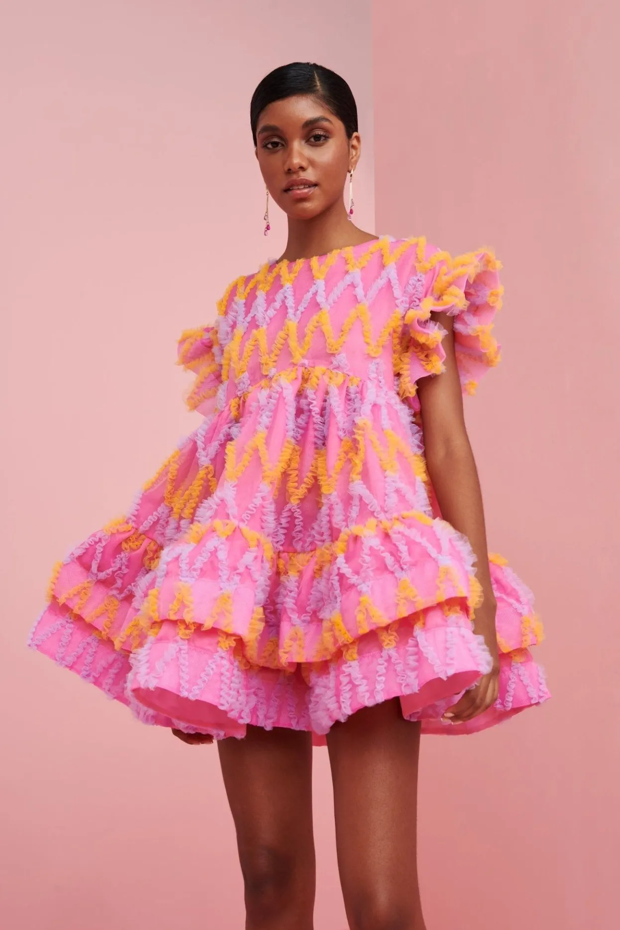 Bright Pink And Yellow Embroidered Dress With A Layered, Stunning Voluminous Skirt, Complemented By Two Tie Closures In The Back. This Mini Dress Is A Stunner.