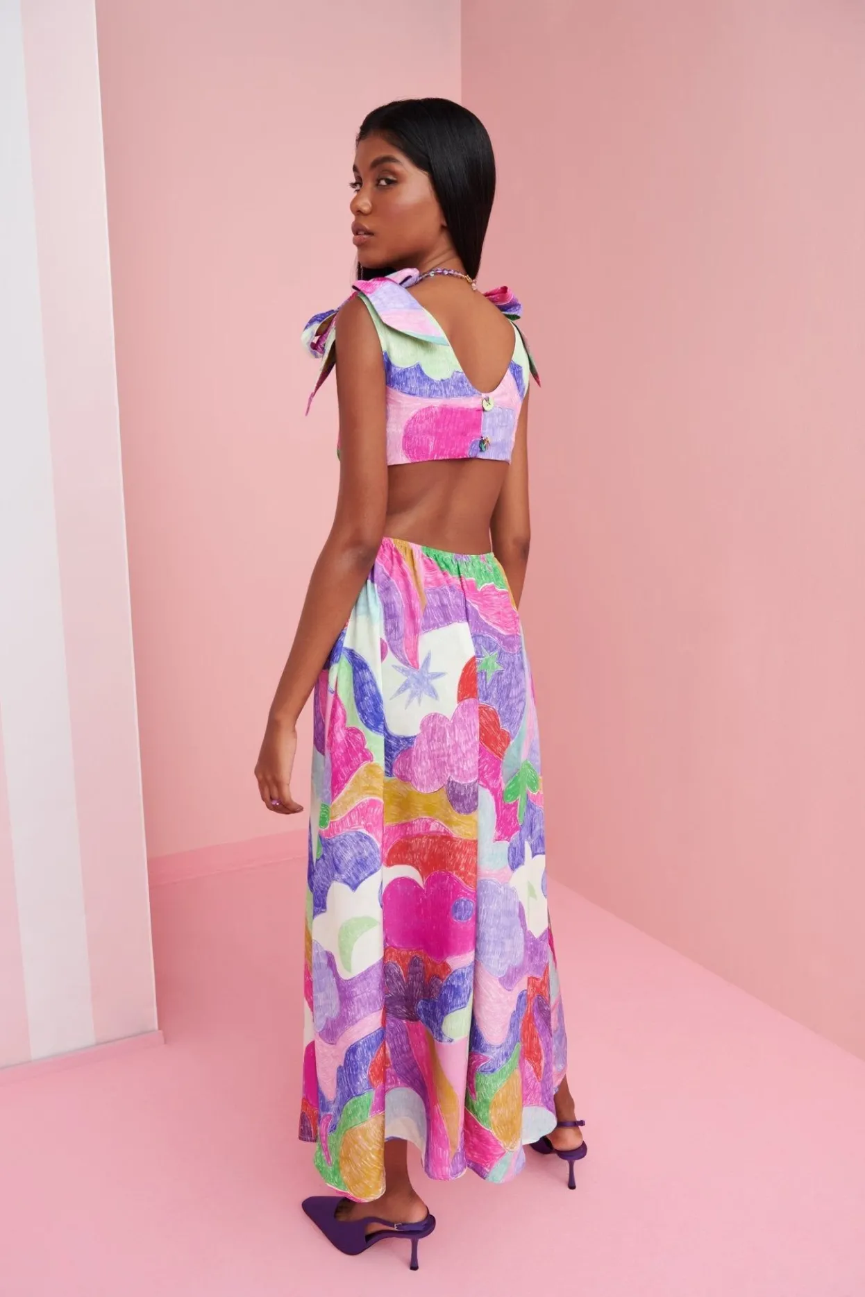With A Pink Cloud Themed Print, The Echoes Dress Is Perfect For An Ethereal Summer Event. The Adjustable Bow Straps, A Brand Staple, Paired With The Plunging V-Neck And Waist Cut-Outs Will Make Everyone Stare In Awe!