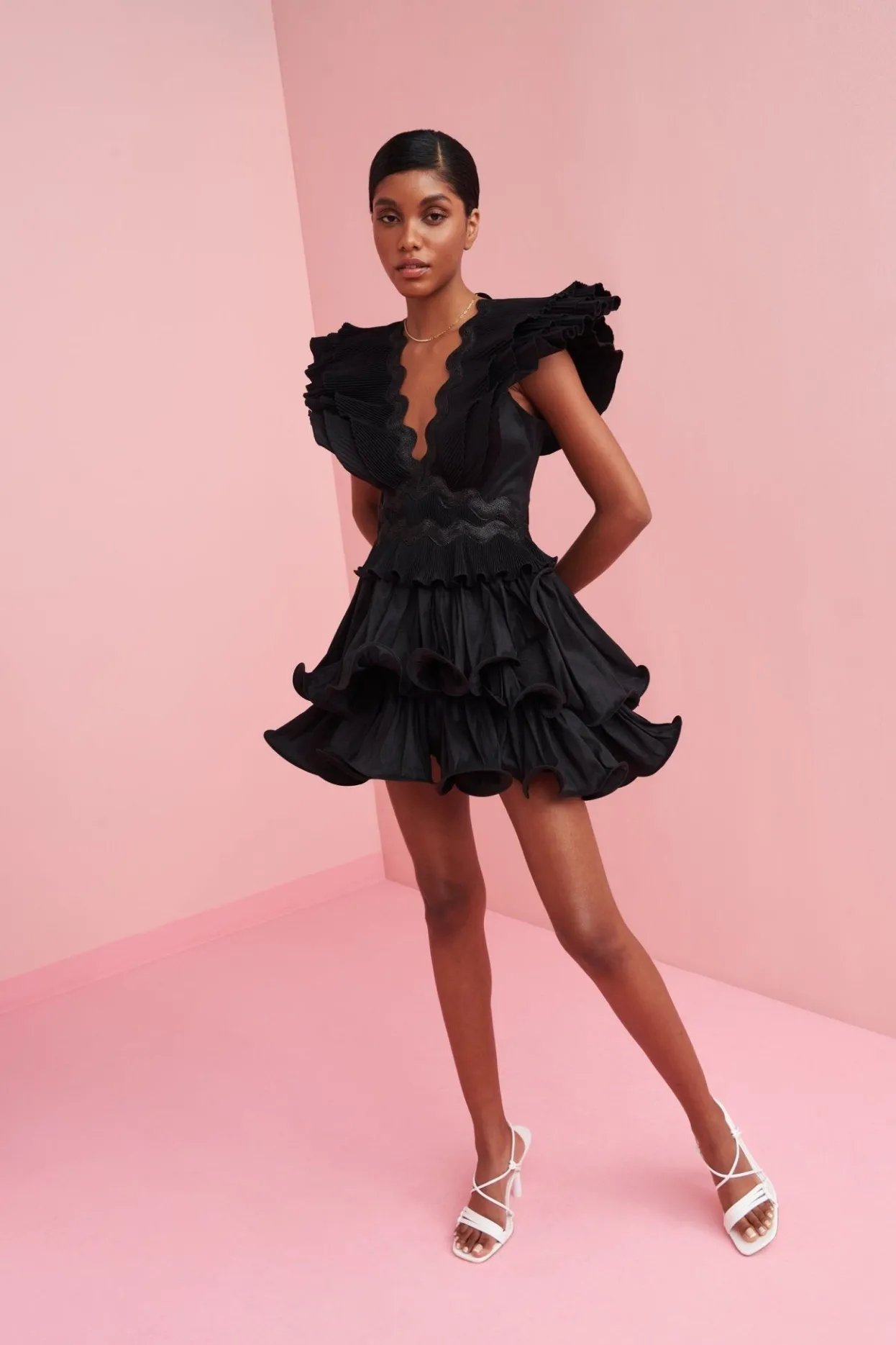 Everyone Needs A Little Black Dress. This Season, With A Plunging V-Neck, Paired With Ruffled Short Sleeves And A Short, Voluminously Layered Skirt. Playful And Sexy All At Once!