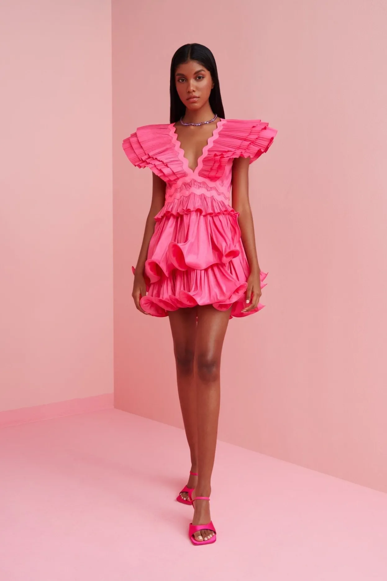 Plunging V-Neck, Paired With Ruffled Short Sleeves And A Short, Voluminously Layered Skirt. This Hot-Pink Number Is Perfect For A Happy Hour With Your Girlfriends! Playful And Sexy All At Once!