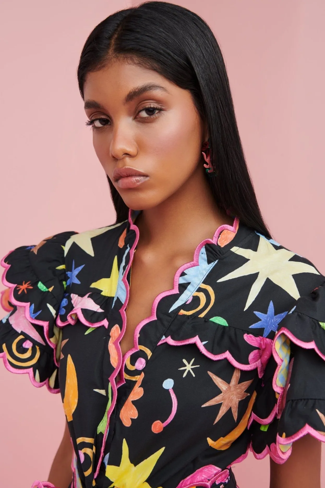 A Celia B Classic Summer Staple, This Season In A Vibrant Midnight Theme With Colorful Star Motifs. This Short, Ruffled Skirt Dress With Scalloped Details And Short Sleeves, With Pink Colored Accents Is Perfect For A Summer Night Event!
