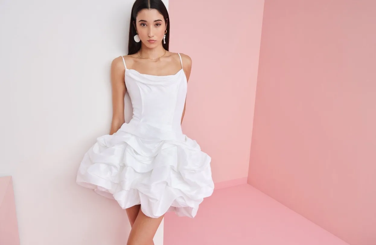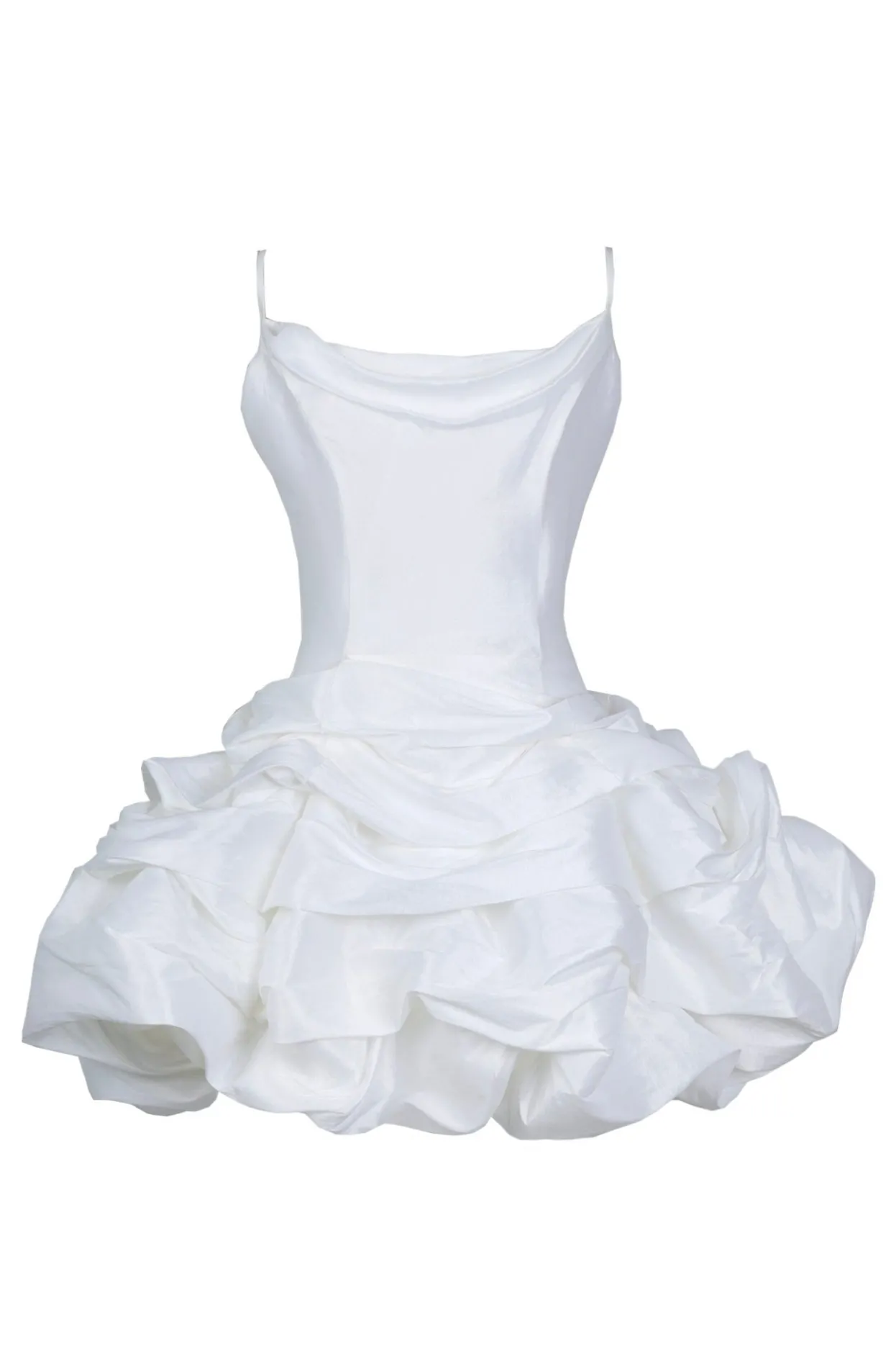 This Uniquely Summery White Dress Counts With Spaghetti Staps, A Cowl Neckline And A Ruffled, Voluminous Short Skirt. This Piece Is Both Flattering And A Statement. Perfect For A Summer Evening Event!