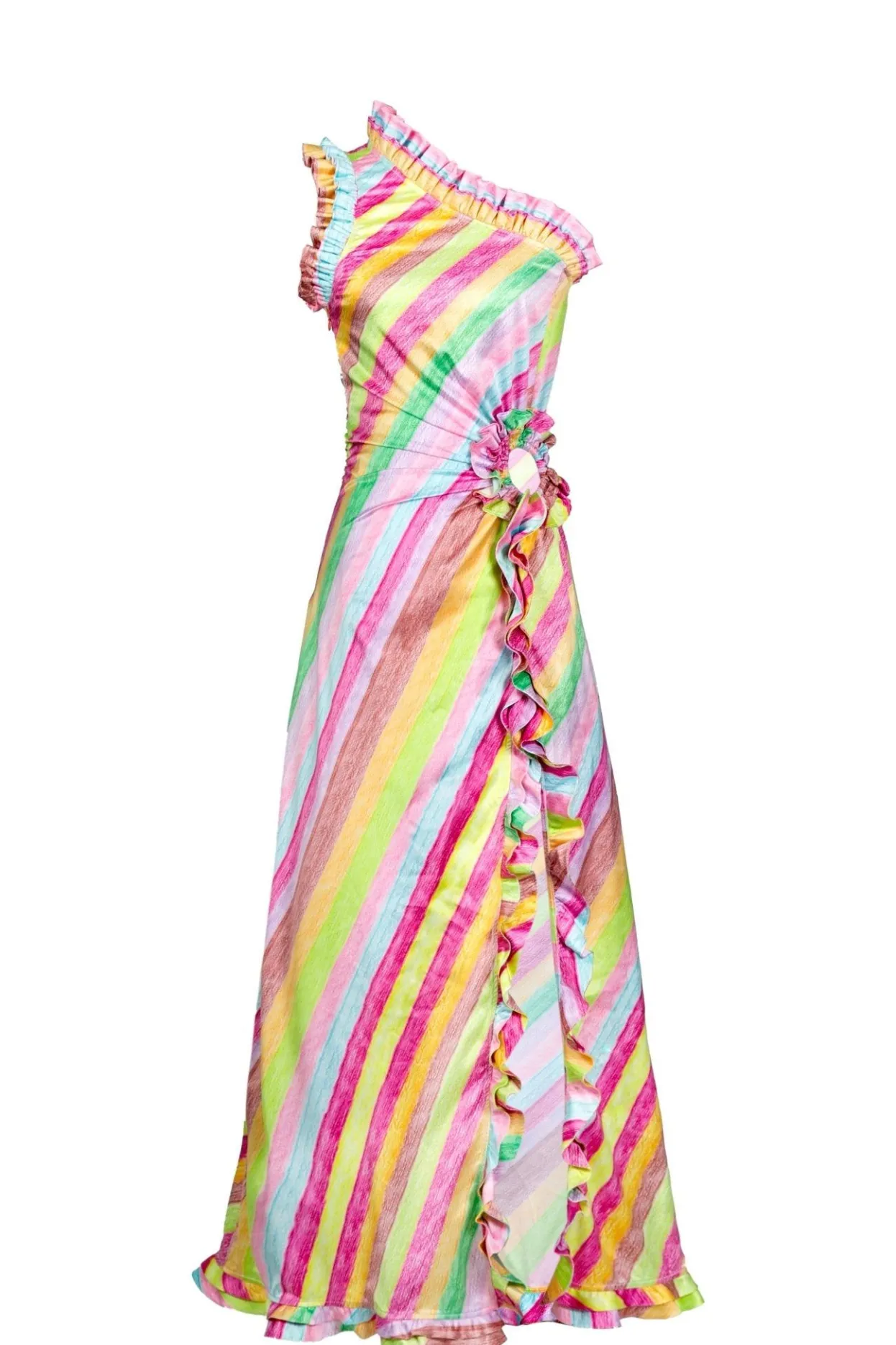 Off The Shoulder, Long, Cut-Out Detail By The Waist And A Ruffled Edge… The Cherry On Top Of This Sexy Piece Is It’S Unique Stripped Print.