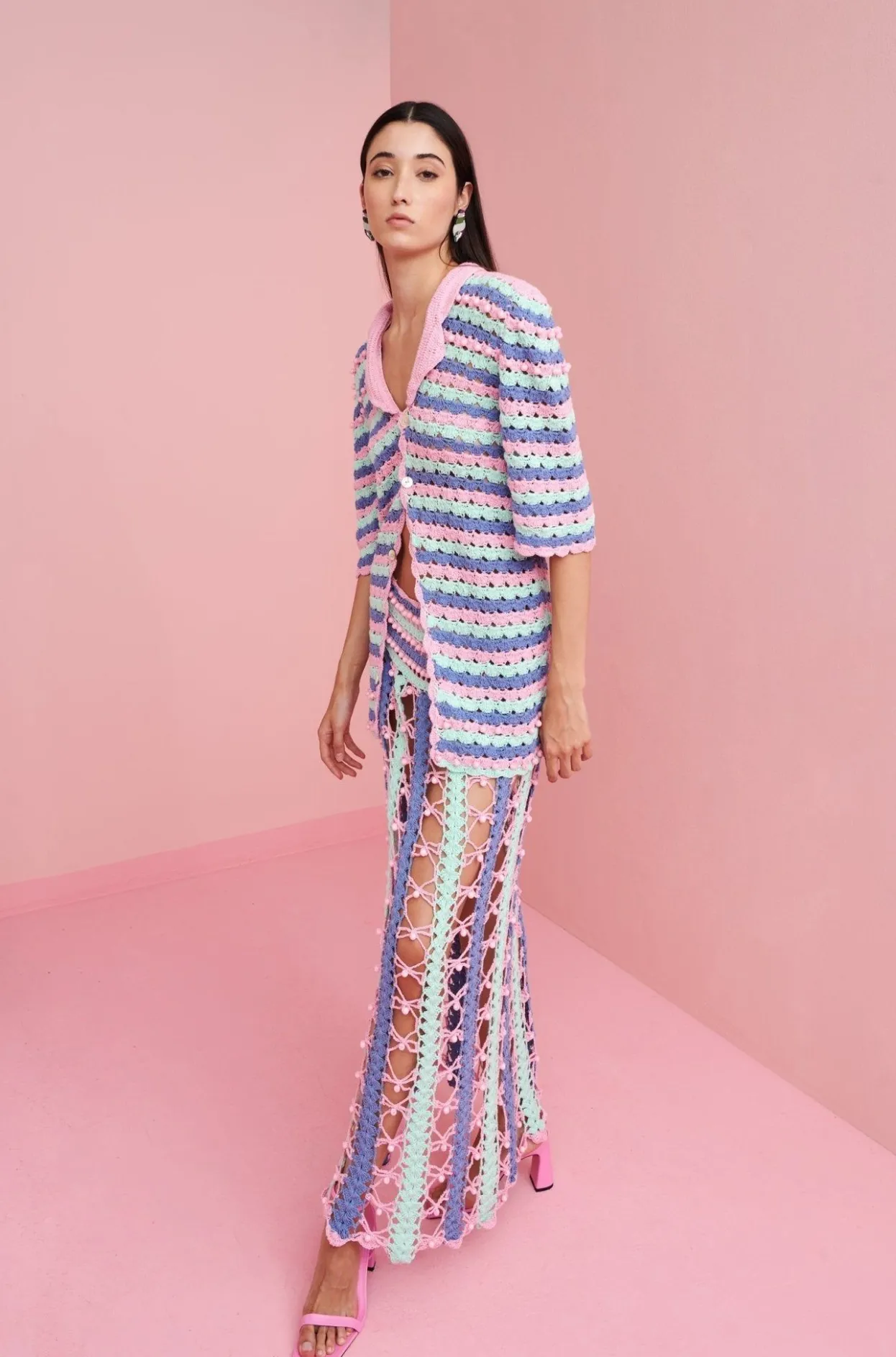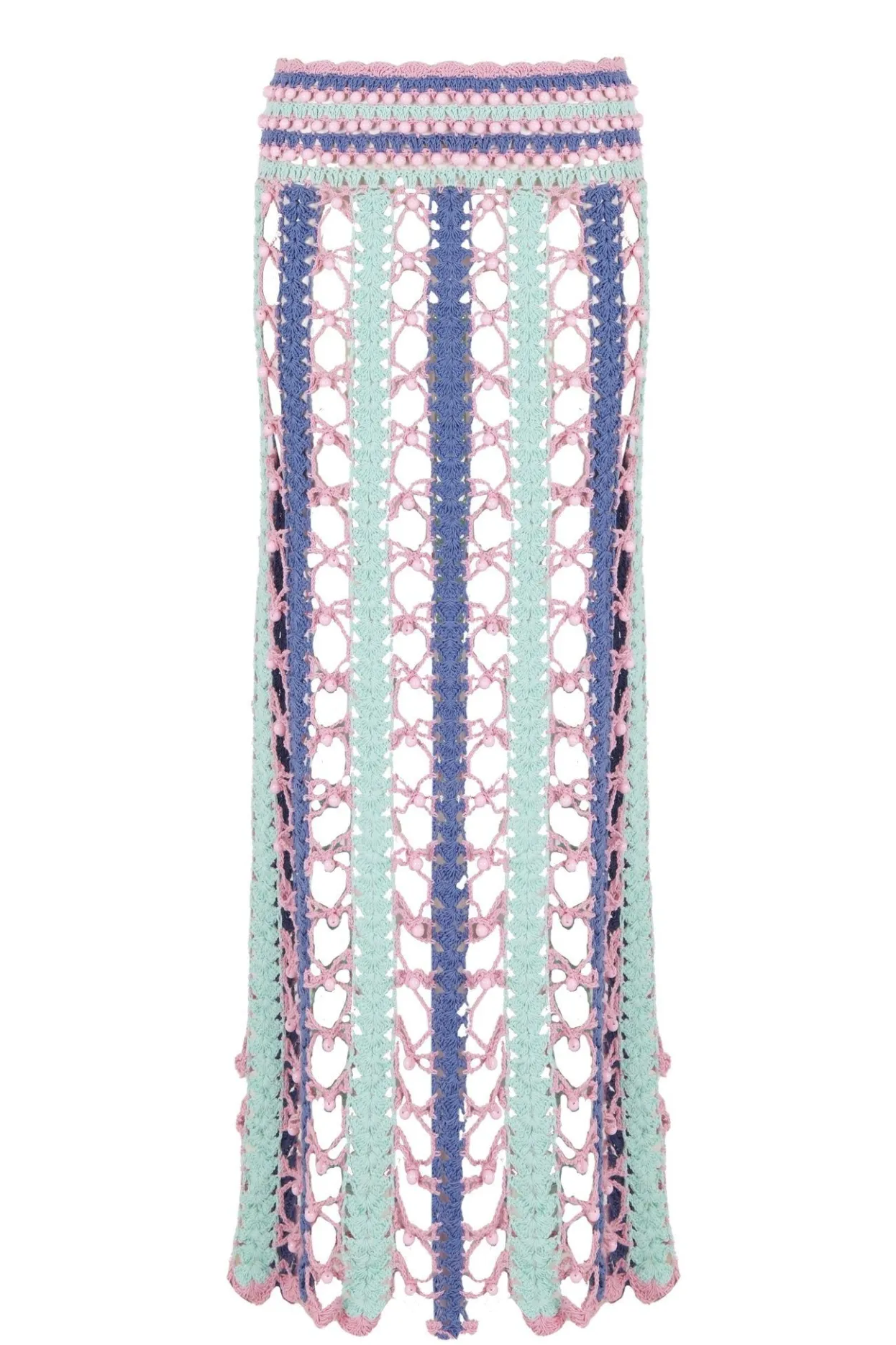 Stunning, Figure Hugging See-Through Crochet Skirt In Pastel Purple, Pink And Turquoise Colors With Bead Detailing Throughout. The Scalloped Edge Is The Perfect Finish. This Skirt Is Ideal For A Beach Lunch, Paired With Our Gaia Or Befly Tops!