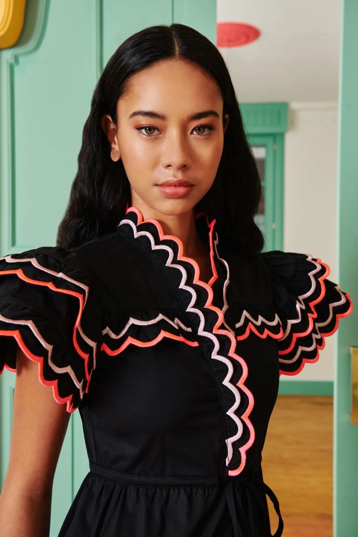 We Love This Black Dress With A Pop Of Soft And Neon Pink In The Thick Embroidered Scalloped Detailing. Button Down With Drawstring Tie And Side Pockets, Your Perfect Everyday Dress.