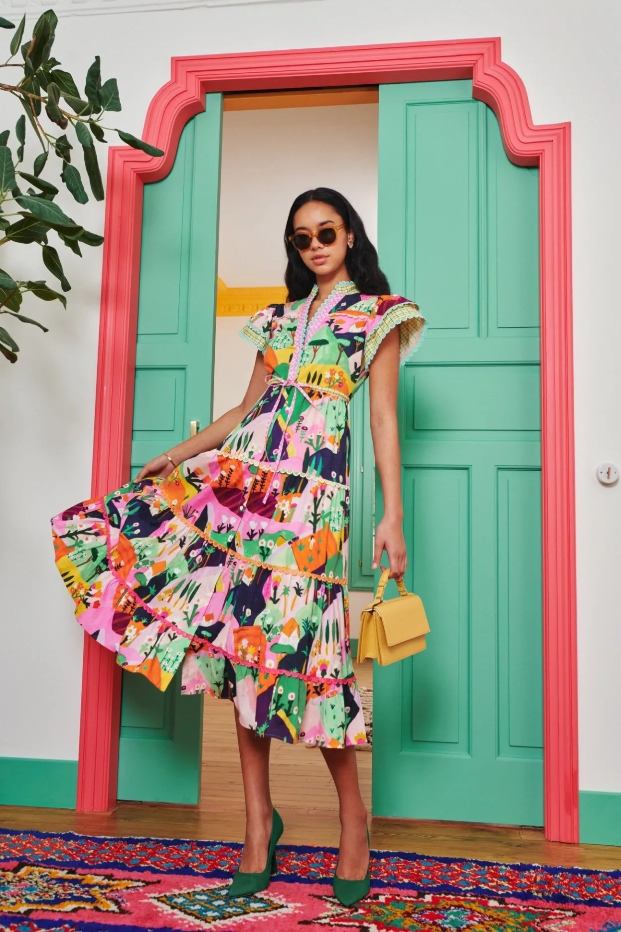 Our Best Selling Shape In A Novelty Landscape Printed Midi Dress Made From A Recycled Cotton Blend. Scalloped Trims At Sleeves And Skirt With An Easy Drawstring Tie Create A Flattering Silhouette.