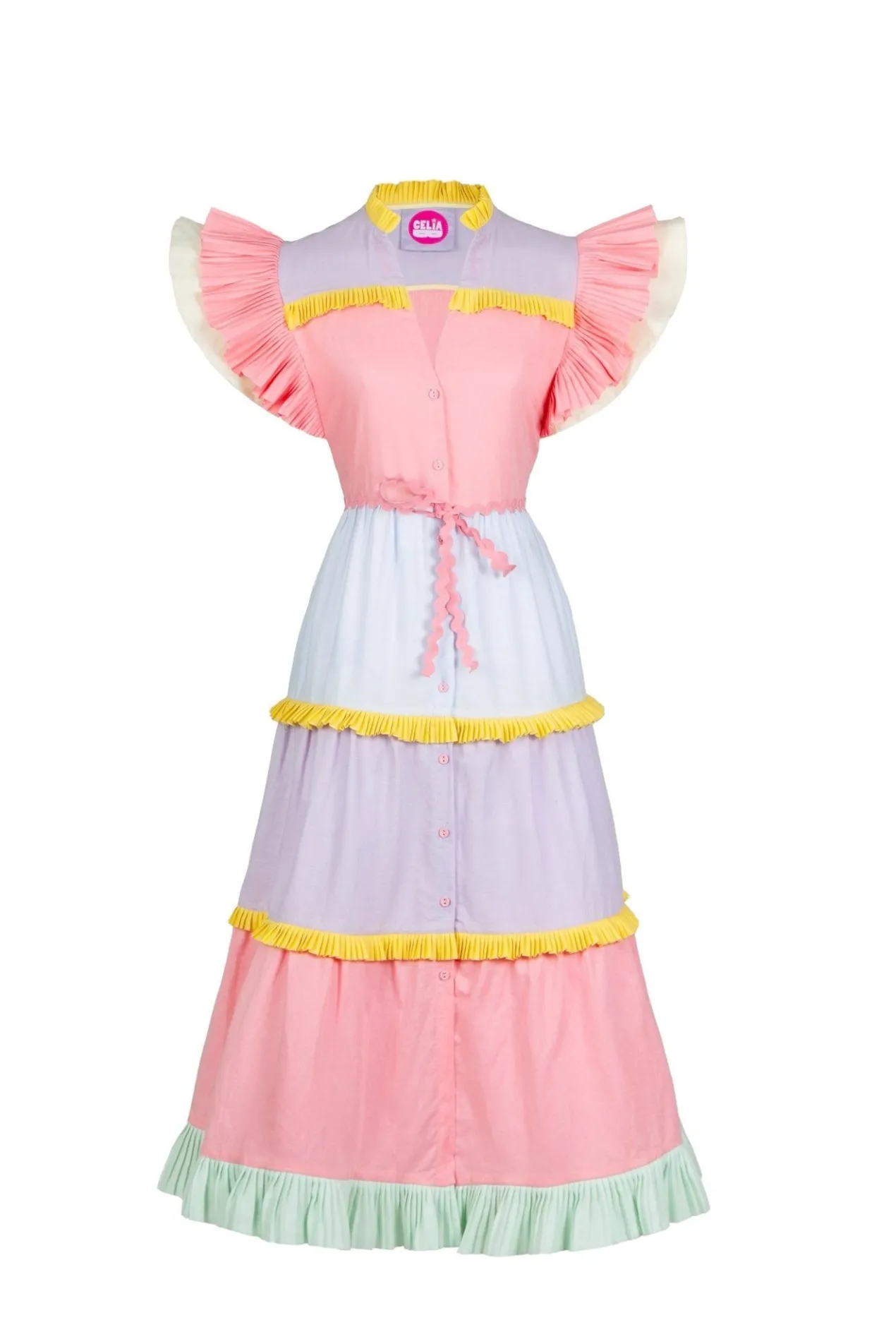 Looking For A Pastel Color Explosion? Look No Further! This Midi, Short-Sleeved, Ruffled Pastel Number Is Just The One! The Button Down Feature And Adjustable Waist Allow You To Play With Its Structure, Making It Perfect For You.