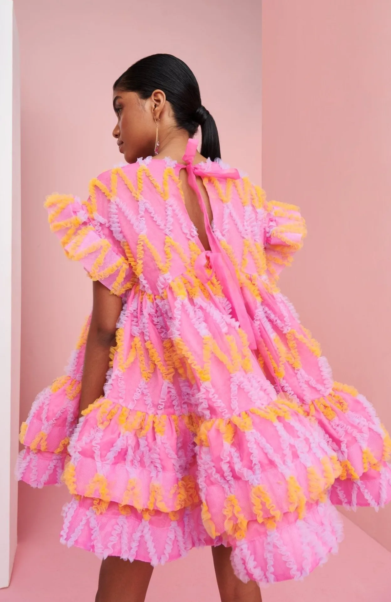 Bright Pink And Yellow Embroidered Dress With A Layered, Stunning Voluminous Skirt, Complemented By Two Tie Closures In The Back. This Mini Dress Is A Stunner.