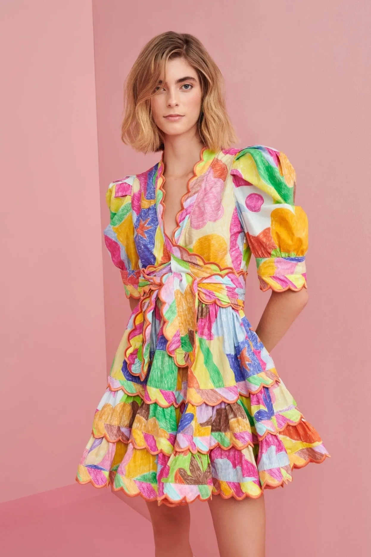 Colorful Printed Mini Dress, Featuring Puff Sleeves, A Belt And Our Characteristic Scalloped Edges. This Piece Is The Height Of Summer Fashion Fun!