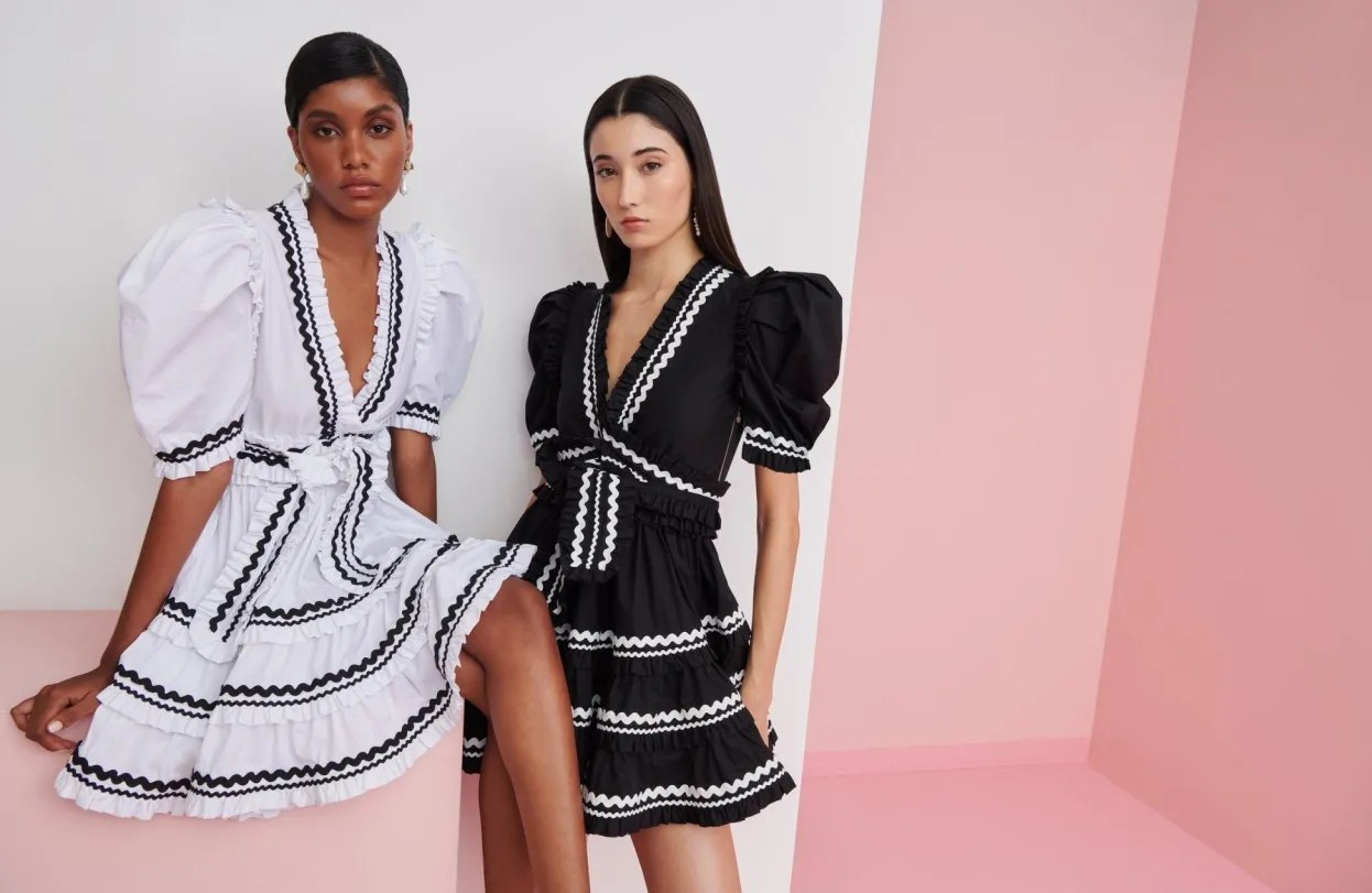 White Mini Dress With Black Details In The Neckline, Sleeves And Around The Skirt. The Puffed Sleeves, Voluminous Skirt And Deep Neckline Ensure The Dress Is Form Fitting And Femenine, While Remaining Playfully Elegant !