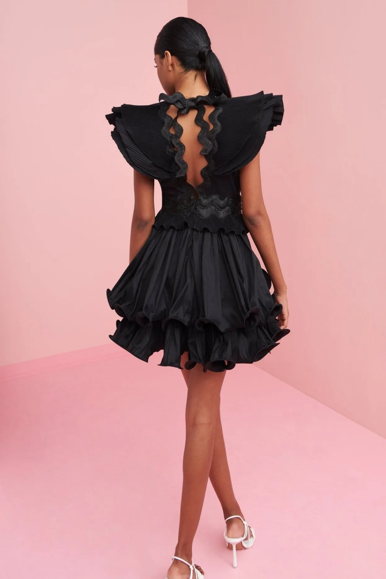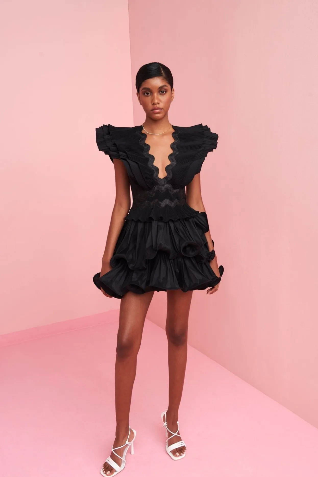 Everyone Needs A Little Black Dress. This Season, With A Plunging V-Neck, Paired With Ruffled Short Sleeves And A Short, Voluminously Layered Skirt. Playful And Sexy All At Once!