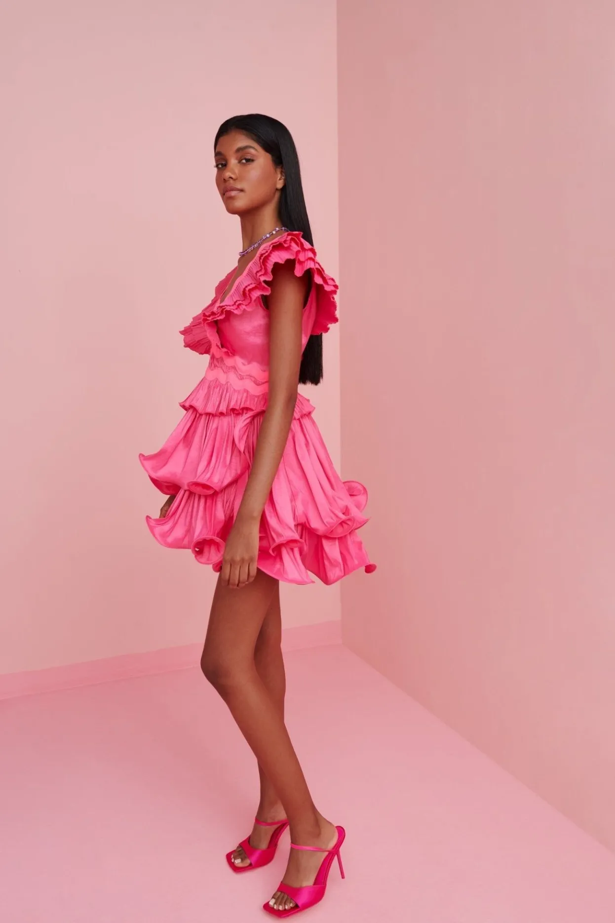 Plunging V-Neck, Paired With Ruffled Short Sleeves And A Short, Voluminously Layered Skirt. This Hot-Pink Number Is Perfect For A Happy Hour With Your Girlfriends! Playful And Sexy All At Once!