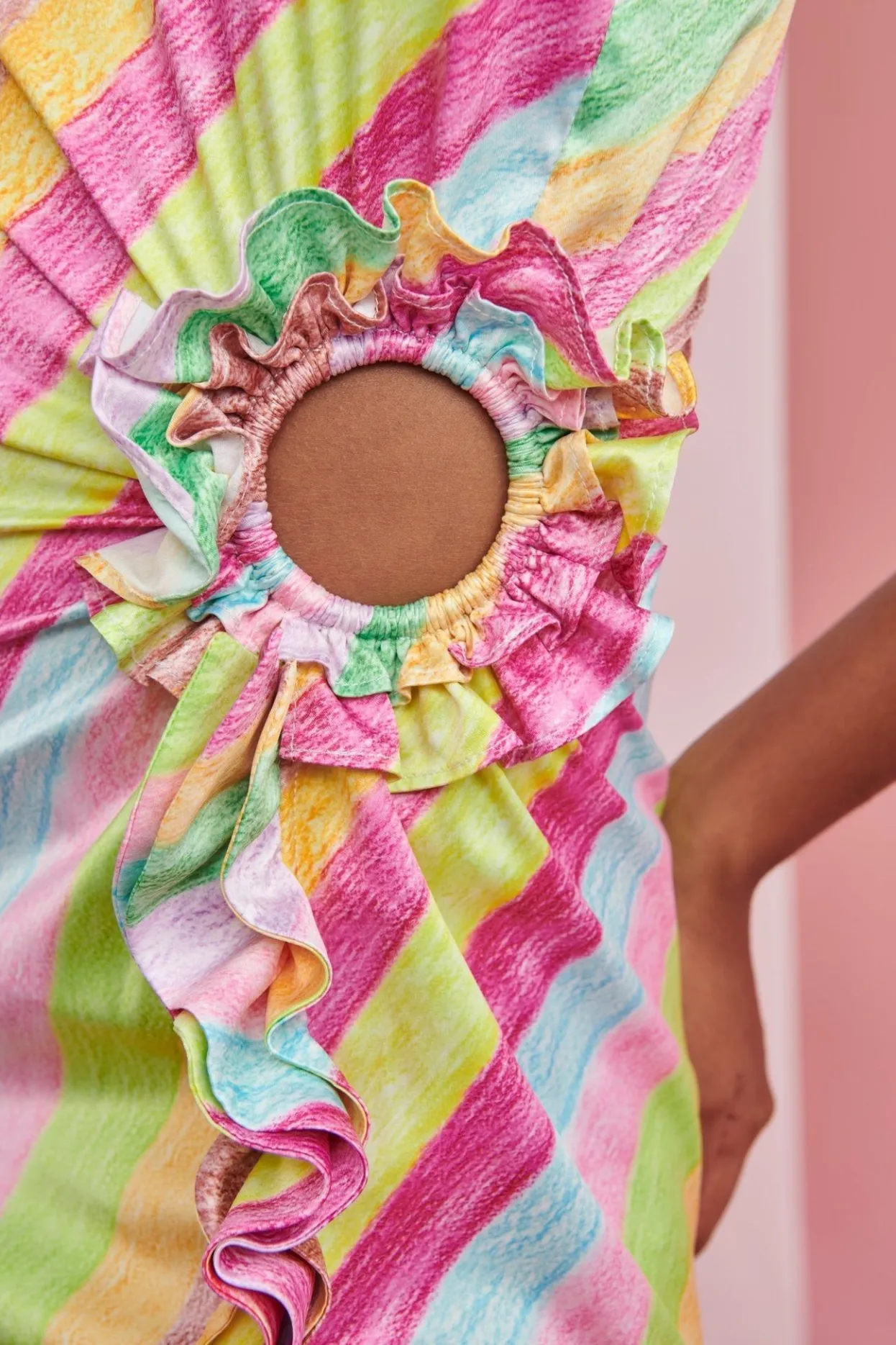 Off The Shoulder, Long, Cut-Out Detail By The Waist And A Ruffled Edge… The Cherry On Top Of This Sexy Piece Is It’S Unique Stripped Print.