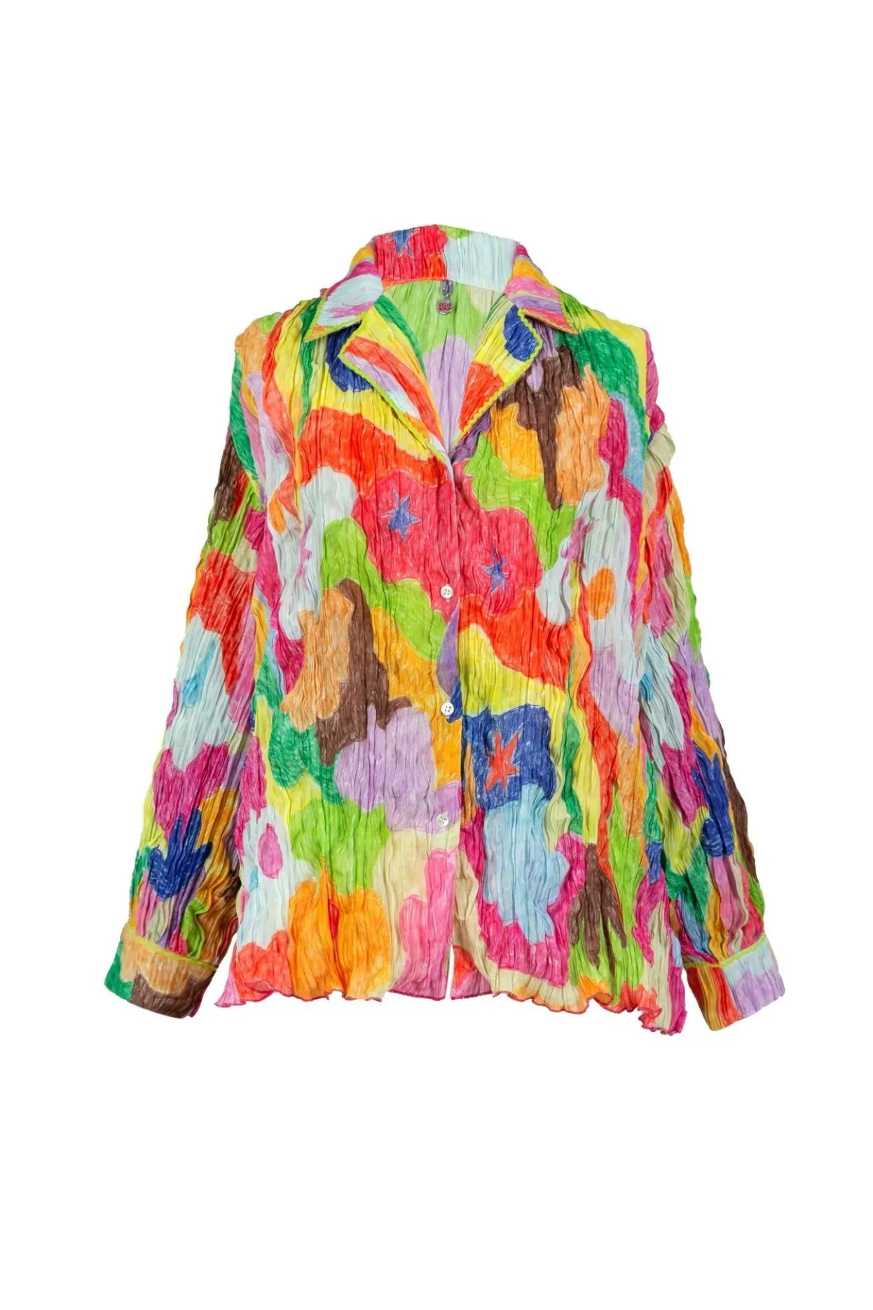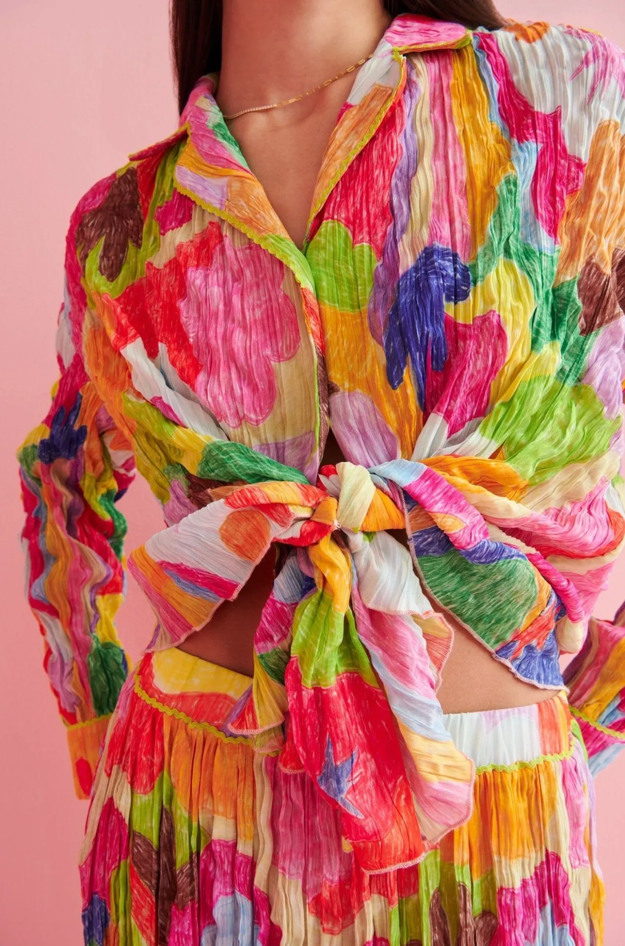 Button Down Vibrantly Printed Long-Sleeve Flowy Shirt. Pair It With The Matching Skirt For An Effortlessly Chic Look, Perfect For Any Event By The Beach.